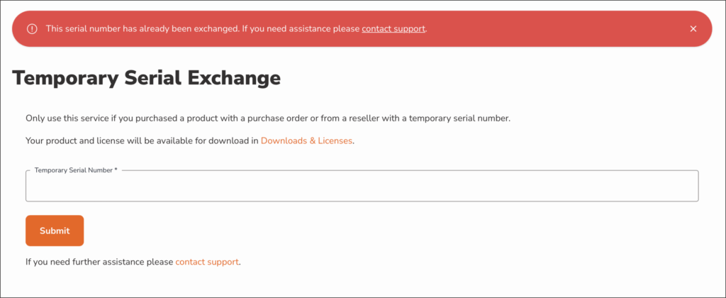 aescriptsに仮ライセンスをエクスチェンジ済の場合、This serial number has already been exchaned.(このシリアルはエクスチェンジ済です。)と表示されます。